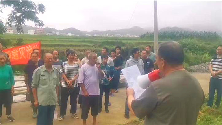 本次演练主要模拟持续多日强降暴雨,青龙村巡查责任人黄启灯在日常的巡查工作中发现姚家冲水库水位超过警戒线并持续上涨,坝体外坡倒滤体基脚散浸中发现浑水并塌方,有可能引发溃坝事故发生,青龙村地质灾害点出现滑坡险情为背景,巡查责任人黄书记迅速用铜锣敲响预警撤离信号,同时向镇应急班报告险情。接到“险情报告”后,青龙村值班人员迅速向镇应急办汇报,立即启动应急预案,迅速调度应急抢险、后勤保障、群众疏散、抢险技术等工作小组立即奔赴“灾情点”,有序疏散周边和受威胁地段群众并妥善安置。